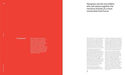 Food Futures is structured in three main sections, each of which will encompass design projects appropriate to different categories. These sections will help to shape an understanding of the various ways in which the project has been fabricated and will be titled, respectively, 'Two Dimensional', 'Three Dimensional' and 'Multi Sensory' (experiential).
